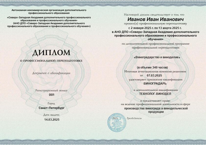 - Диплом АНО ДПО «МАСХ» с присвоением квалификации «Виноградарь» и доп. квалификации «Технолог-винодел» в сфере производства винограда и винодельческой продукции.
